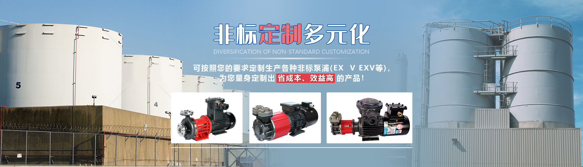 可根據(jù)您的工藝需求定制特殊電壓(V)、頻率(HZ)、防爆(EX)、防爆(EX)+變頻(V)等特殊產(chǎn)品,批量個(gè)性化定制開(kāi)發(fā)等,給您提升效率,降低成本。不斷追求技術(shù)創(chuàng)新、得到更多企業(yè)認(rèn)可。公司產(chǎn)品包括旋渦磁力泵、輕型離心磁力泵、化工離心磁力泵、襯氟磁力泵、精密旋渦泵、大流量離心泵、小型高壓葉片泵、不銹鋼多級(jí)泵、立式管道泵等;產(chǎn)品耐溫范圍從低溫-196℃到高溫+400℃,涉及化工、環(huán)保、印染、醫(yī)藥、半導(dǎo)體、新能源、汽車、電子、軍工、食品、石油和通用機(jī)械等行業(yè)領(lǐng)域。
